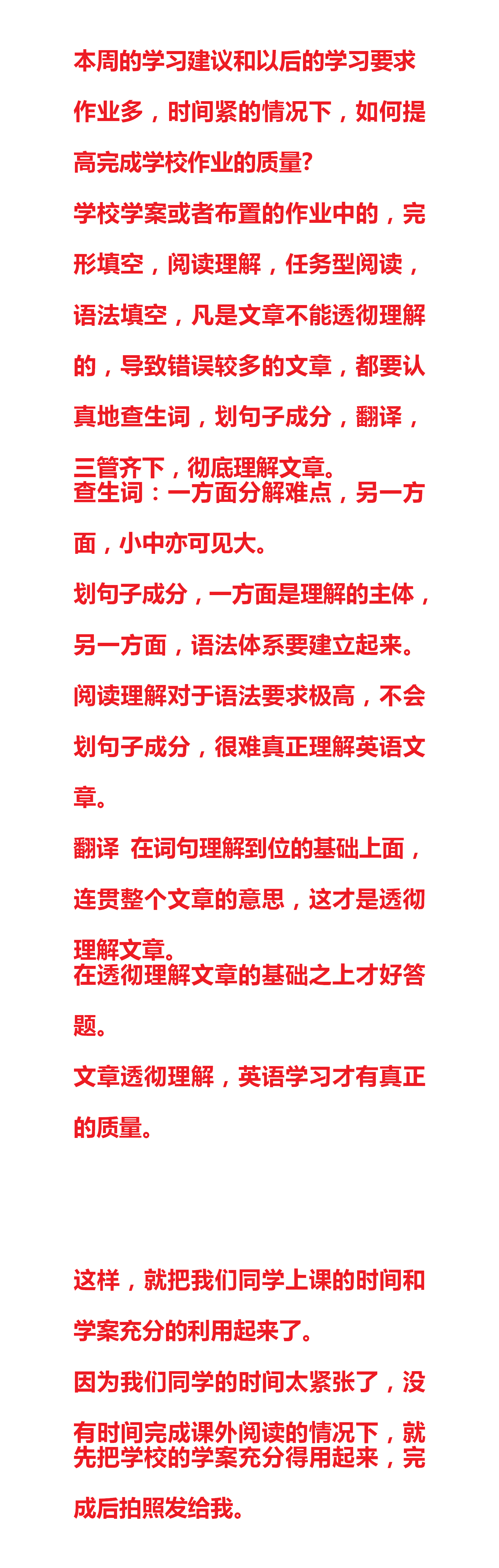 本周的学习建议和以后的学习要求提高我们同学在平时完成学校作业的质量。怎么提高?学校学案或者布置的作业中的,完形填空,阅读理解,任务型阅读,语法填空,凡是文章不能透彻理解的,都要认真地查生词,划句子成分,翻译,三管齐下,彻底理解文章。这样,就把我们同学上课的时间和学案充分的利用起来了。 因为我们同学的时间太紧张了。